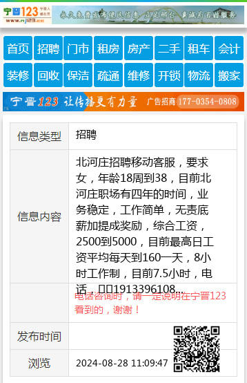 北河庄招聘移动客服,要求女,年龄18周到38,目前北河庄职场有四年的时间,业务稳定,工作简单,无责底薪加提成奖励,综合工资,2500到5000,目前最高日工资平均每天到160一天,8小时工作制,目前7.5小时,电话,19133961086,地址,北河庄小区底商 【电话咨询时,请一定说明在宁晋123看到的,谢谢!】 |