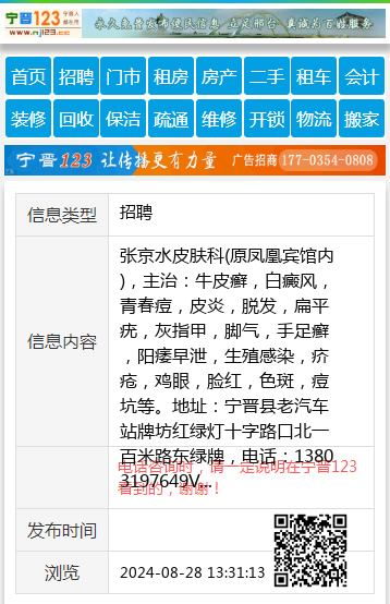 张京水皮肤科(原凤凰宾馆内),主治:牛皮癣,白癜风,青春痘,皮炎,脱发,扁平疣,灰指甲,脚气,手足癣,阳痿早泄,生殖感染,疥疮,鸡眼,脸红,色斑,痘坑等。地址:宁晋县老汽车站牌坊红绿灯十字路口北一百米路东绿牌,电话:13803197649V同 【电话咨询时,请一定说明在宁晋123看到的,谢谢!】 |