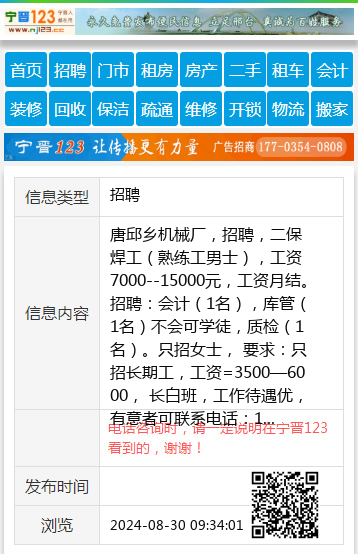 唐邱乡机械厂,招聘,二保焊工(熟练工男士),工资7000--15000元,工资月结。招聘:会计(1名),库管(1名)不会可学徒,质检(1名)。只招女士, 要求:只招长期工,工资=3500—6000, 长白班,工作待遇优,有意者可联系电话:18714284394 另诚聘:销售精英(女士),底薪=6000元---20000元,过试用期底薪上调,要求:高中以上文凭,敢于冲刺目标业绩,要有上进心爱好销售职业,沟通力强,会开车,有有上进心,必需电话销售经验长达2年以上,月公休4天,工作时间8小时,有意者可联系电话:18717284394 销售工作地址:可县城上班, 可以工厂上班。两者任选。 【电话咨询时,请一定说明在宁晋123看到的,谢谢!】 |