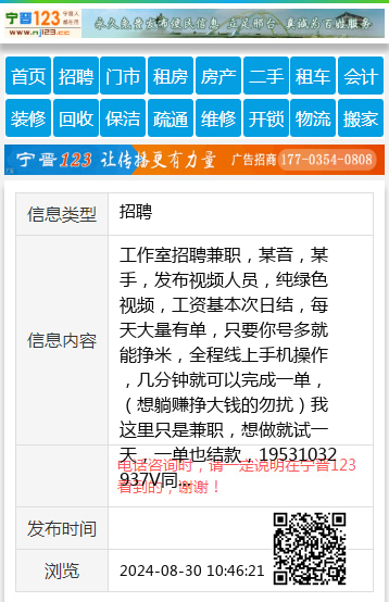 工作室招聘兼职,某音,某手,发布视频人员,纯绿色视频,工资基本次日结,每天大量有单,只要你号多就能挣米,全程线上手机操作,几分钟就可以完成一单,(想躺赚挣大钱的勿扰)我这里只是兼职,想做就试一天,一单也结款,19531032937V同 【电话咨询时,请一定说明在宁晋123看到的,谢谢!】 |