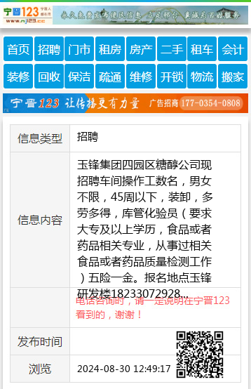玉锋集团四园区糖醇公司现招聘车间操作工数名,男女不限,45周以下,装卸,多劳多得,库管化验员(要求大专及以上学历,食品或者药品相关专业,从事过相关食品或者药品质量检测工作)五险一金。报名地点玉锋研发楼18233072928 【电话咨询时,请一定说明在宁晋123看到的,谢谢!】 |