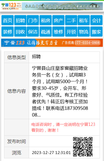 宁晋县山庄皇家窖藏招聘业务员一名(女),试用期3个月,试用期5000一个月!要求30-45岁,会开车、形象好、气质佳。有工作经验者优先!转正后考核工资加提成!联系电话18730950808 【电话咨询时,请一定说明在宁晋123看到的,谢谢!】 |