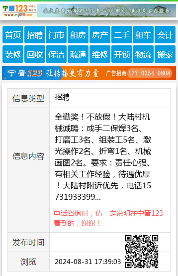 全勤奖!不放假!大陆村机械诚聘:成手二保焊3名、打磨工3名、组装工5名、激光操作2名、折弯1名、机械画图2名。要求:责任心强、有相关工作经验,待遇优厚!大陆村附近优先,电话15731933399 【电话咨询时,请一定说明在宁晋123看到的,谢谢!】 |