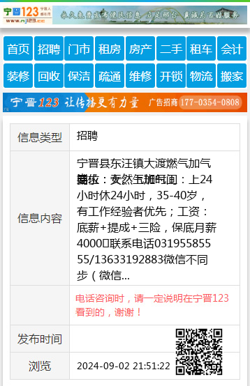 要求:女。上班时间:上24小时休24小时,35-40岁,有工作经验者优先;工资:底薪+提成+三险,保底月薪4000➕联系电话03195585555/13633192883微信不同步(微信号:lmq18881888) 【电话咨询时,请一定说明在宁晋123看到的,谢谢!】 |