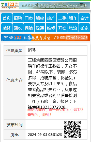 玉锋集团四园区糖醇公司招聘车间操作工数名,男女不限,45周以下,装卸,多劳多得,招聘库管,化验员(要求大专及以上学历,食品或者药品相关专业,从事过相关食品或者药品质量检测工作)五险一金。报名:玉锋集团18233072928 【电话咨询时,请一定说明在宁晋123看到的,谢谢!】 |
