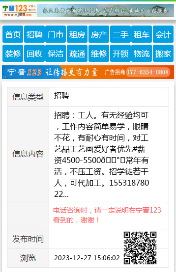 招聘:工人。有无经验均可,工作内容简单易学,眼睛不花,有耐心有时间,对工艺品工艺画爱好者优先#薪资4500-5500🅰️常年有活,不压工资。招学徒若干人,可代加工。15531878022 【电话咨询时,请一定说明在宁晋123看到的,谢谢!】 |