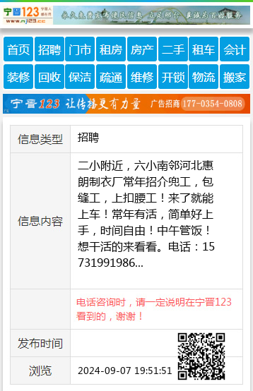 二小附近,六小南邻河北惠朗制衣厂常年招介兜工,包缝工,上扣腰工!来了就能上车!常年有活,简单好上手,时间自由!中午管饭!想干活的来看看。电话:15731991986 【电话咨询时,请一定说明在宁晋123看到的,谢谢!】 |