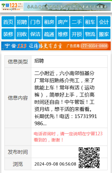 二小附近,六小南邻恒基分厂常年招熟练介兜工,来了就能上车!常年有活(运动裤),简单好上手,工价高时间还自由!中午管饭!工资月结,想干活的来看看。长期优先!电话:15731991986 【电话咨询时,请一定说明在宁晋123看到的,谢谢!】 |