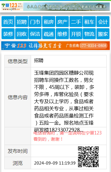 玉锋集团四园区糖醇公司现招聘车间操作工数名,男女不限,45周以下,装卸,多劳多得,库管化验员(要求大专及以上学历,食品或者药品相关专业,从事过相关食品或者药品质量检测工作)五险一金。报名地点玉锋研发楼18233072928