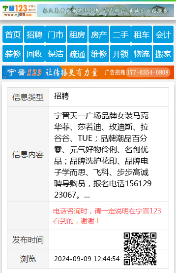 宁晋天一广场品牌女装马克华菲、莎若迪、玫迪斯、拉谷谷、TUE;品牌潮品百分零、元气好物伶俐、名创优品;品牌洗护花印、品牌电子学而思、飞科、步步高诚聘导购员,报名电话15612923067。 【电话咨询时,请一定说明在宁晋123看到的,谢谢!】 |