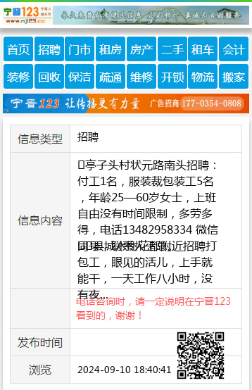❶亭子头村状元路南头招聘:付工1名,服装裁包装工5名,年龄25—60岁女士,上班自由没有时间限制,多劳多得,电话13482958334 微信同号,联系人王总。
