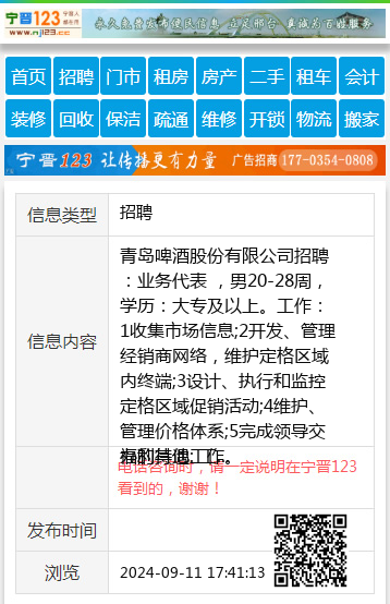 青岛啤酒股份有限公司招聘:业务代表 ,男20-28周,学历:大专及以上。工作:1收集市场信息;2开发、管理经销商网络,维护定格区域内终端;3设计、执行和监控定格区域促销活动;4维护、管理价格体系;5完成领导交办的其他工作。
