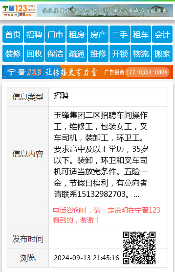 玉锋集团二区招聘车间操作工,维修工,包装女工,叉车司机,装卸工,环卫工。要求高中及以上学历,35岁以下。装卸,环卫和叉车司机可适当放宽条件。五险一金,节假日福利,有意向者请联系15132982703。 【电话咨询时,请一定说明在宁晋123看到的,谢谢!】 |