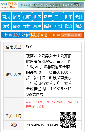 现面对全县男女老少公开招聘网络短剧演员。每天工作2-3小时。想兼职的想全职的都可以,工资每天100起步工资日结,形象没有要求,年龄没有要求,唯一要求会说普通话☎️19131977115微信同号 【电话咨询时,请一定说明在宁晋123看到的,谢谢!】 |