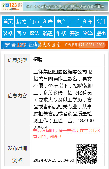 玉锋集团四园区糖醇公司现招聘车间操作工数名,男女不限,45周以下,招聘装卸工,多劳多得,招聘化验员(要求大专及以上学历,食品或者药品相关专业,从事过相关食品或者药品质量检测工作)五险一金。18233072928