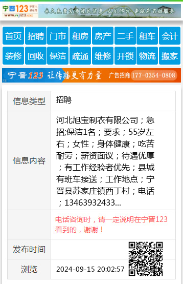 河北旭宝制衣有限公司;急招;保洁1名;要求;55岁左右;女性;身体健康;吃苦耐劳;薪资面议;待遇优厚;有工作经验者优先;县城有班车接送;工作地点;宁晋县苏家庄镇西丁村;电话;13463932433 【电话咨询时,请一定说明在宁晋123看到的,谢谢!】 |