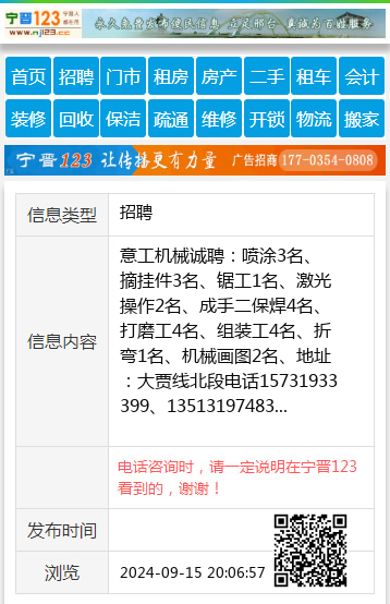 意工机械诚聘:喷涂3名、摘挂件3名、锯工1名、激光操作2名、成手二保焊4名、打磨工4名、组装工4名、折弯1名、机械画图2名、地址:大贾线北段电话15731933399、13513197483 【电话咨询时,请一定说明在宁晋123看到的,谢谢!】 |