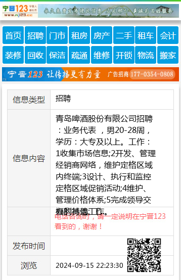 青岛啤酒股份有限公司招聘:业务代表 ,男20-28周,学历:大专及以上。工作:1收集市场信息;2开发、管理经销商网络,维护定格区域内终端;3设计、执行和监控定格区域促销活动;4维护、管理价格体系;5完成领导交办的其他工作。