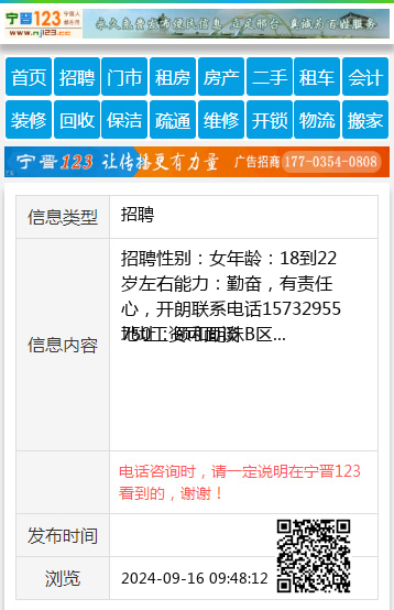 招聘性别:女年龄:18到22岁左右能力:勤奋,有责任心,开朗联系电话15732955750工资可面谈
