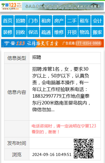 招聘:库管1名,女,要求30岁以上,50岁以下,认真负责,会电脑基本操作,有一年以上工作经验联系电话:18832997779工作地点童泰东行200米路南圣婴岛院内,微信勿加 【电话咨询时,请一定说明在宁晋123看到的,谢谢!】 |