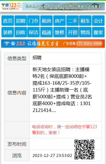 新天地女装店招聘:主播模特2名(保底底薪8000起+提成163-168/25-35岁/105-115斤)主播助理一名(底薪5000起+提成)营业员2名底薪4000+提成电话:13012121414. 【电话咨询时,请一定说明在宁晋123看到的,谢谢!】 |