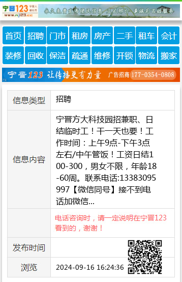 宁晋方大科技园招兼职、日结临时工!干一天也要!工作时间:上午9点-下午3点左右/中午管饭!工资日结100-300,男女不限,年龄18-60周。联系电话:13383095997【微信同号】接不到电话加微信