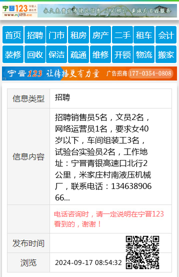 招聘销售员5名,文员2名,网络运营员1名,要求女40岁以下,车间组装工3名,试验台实验员2名,工作地址:宁晋青银高速口北行2公里,米家庄村南液压机械厂,联系电话:13463890666 【电话咨询时,请一定说明在宁晋123看到的,谢谢!】 |