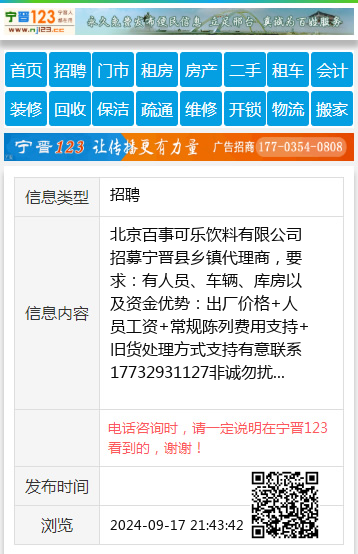 北京百事可乐饮料有限公司招募宁晋县乡镇代理商,要求:有人员、车辆、库房以及资金优势:出厂价格+人员工资+常规陈列费用支持+旧货处理方式支持有意联系17732931127非诚勿扰