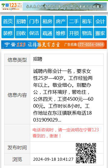 诚聘内账会计一名,要求女性25岁—40岁。工作经验两年以上。敬业细心。别墅办公,工作环境好,管吃住,公休四天,工资4500元—6000元。工作时长8小时。工作地址在东汪镇联系电话18031909029