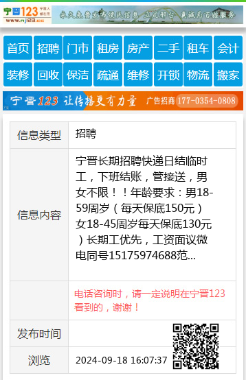宁晋长期招聘快递日结临时工,下班结账,管接送,男女不限!!年龄要求:男18-59周岁(每天保底150元)女18-45周岁每天保底130元)长期工优先,工资面议微电同号15175974688范 【电话咨询时,请一定说明在宁晋123看到的,谢谢!】 |