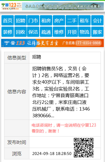 招聘销售员5名,文员(会计)2名,网络运营2名,要求女40岁以下,车间组装工3名,实验台实验员2名,工作地址:宁晋县青银高速口北行2公里,米家庄南口液压机械厂,联系电话:13463890666 【电话咨询时,请一定说明在宁晋123看到的,谢谢!】 |