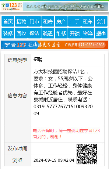 方大科技园招聘保洁1名,要求:女,55周岁以下,公休多、工作轻松,身体健康有工作经验者优先,最好在县城附近居住,联系电话:0319-5777767/15100932009 【电话咨询时,请一定说明在宁晋123看到的,谢谢!】 |