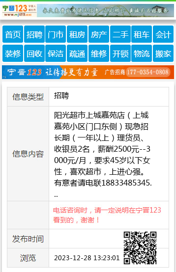 阳光超市上城嘉苑店(上城嘉苑小区门口东侧)现急招长期(一年以上)理货员、收银员2名,薪酬2500元--3000元/月,要求45岁以下女性,喜欢超市,上进心强。有意者请电联18833485345 【电话咨询时,请一定说明在宁晋123看到的,谢谢!】 |