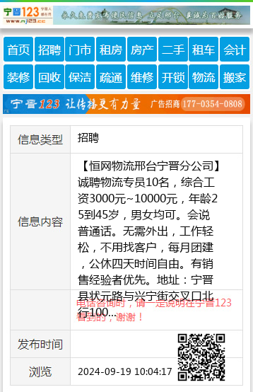 【恒网物流邢台宁晋分公司】诚聘物流专员10名,综合工资3000元~10000元,年龄25到45岁,男女均可。会说普通话。无需外出,工作轻松,不用找客户,每月团建,公休四天时间自由。有销售经验者优先。地址:宁晋县状元路与兴宁街交叉口北行100米电话同微15833726613 【电话咨询时,请一定说明在宁晋123看到的,谢谢!】 |