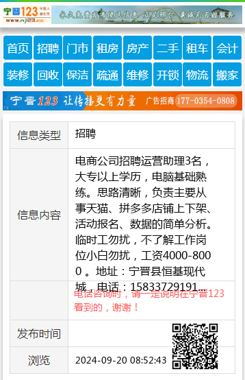 电商公司招聘运营助理3名,大专以上学历,电脑基础熟练。思路清晰,负责主要从事天猫、拼多多店铺上下架、活动报名、数据的简单分析。临时工勿扰,不了解工作岗位小白勿扰,工资4000-8000 。地址:宁晋县恒基现代城,电话:15833729191