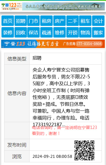 央企人寿宁晋支公司招募售后服务专员,男女不限22-55周岁,高中及以上学历,3小时坐班工作制(时间有弹性宽裕),无责底薪➕绩效奖励+提成。节假日休息。可兼职。中国人寿与您一路幸福同行,办理车险。电话17331922187 【电话咨询时,请一定说明在宁晋123看到的,谢谢!】 |