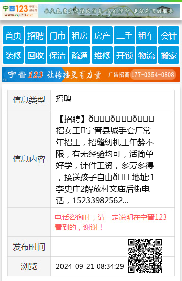 【招聘】🎉🎉🎉招女工✅宁晋县城手套厂常年招工,招缝纫机工年龄不限,有无经验均可,活简单好学,计件工资,多劳多得,接送孩子自由🏠地址:1李史庄2解放村文庙后街电话,15233982562 【电话咨询时,请一定说明在宁晋123看到的,谢谢!】 |