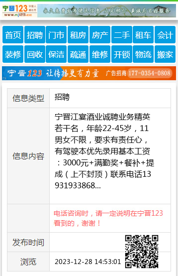 宁晋江宴酒业诚聘业务精英若干名,年龄22-45岁,11男女不限,要求有责任心,有驾驶本优先录用基本工资:3000元+满勤奖+餐补+提成(上不封顶)联系电话13931933868