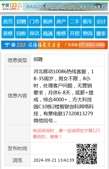 河北移动10086热线客服,18-35周岁,男女不限,8小时,处理客户问题,无营销要求,月休6-8天,底薪+提成,综合4000+,方大科技园C10栋2楼智联创科网络科技,有意电联17320813279微信同号 【电话咨询时,请一定说明在宁晋123看到的,谢谢!】 |