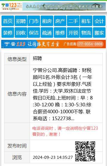 宁晋分公司.高薪诚聘:财税顾问1名.外账会计3名(一年以上经验)要求形象好.气质佳.学历:大学.双休➕法定节假日➕无险.上班时间:早:8:30-12:00 晚:1:30-5:30.综合薪资4000-10000不等. 联系电话:15227381136谷经理