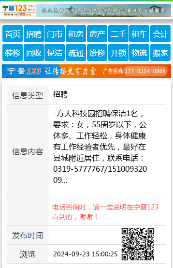 -方大科技园招聘保洁1名,要求:女,55周岁以下,公休多、工作轻松,身体健康有工作经验者优先,最好在县城附近居住,联系电话:0319-5777767/15100932009 【电话咨询时,请一定说明在宁晋123看到的,谢谢!】 |