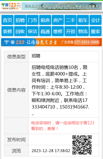 招聘电缆电话销售10名,限女性,底薪4000+提成。上岗有培训,简单易上手,工作时间:上午8:30-12:00,下午1:30-6:00。工作地点:颐和绿洲附近,联系电话17333404710,15031941667 【电话咨询时,请一定说明在宁晋123看到的,谢谢!】 |