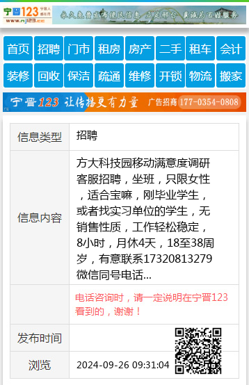 方大科技园移动满意度调研客服招聘,坐班,只限女性,适合宝嘛,刚毕业学生,或者找实习单位的学生,无销售性质,工作轻松稳定,8小时,月休4天,18至38周岁,有意联系17320813279微信同号电话