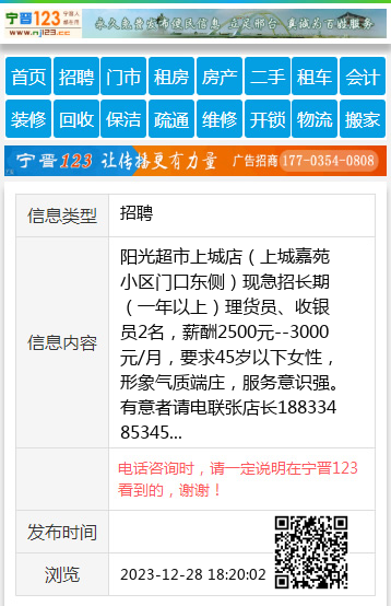 阳光超市上城店(上城嘉苑小区门口东侧)现急招长期(一年以上)理货员、收银员2名,薪酬2500元--3000元/月,要求45岁以下女性,形象气质端庄,服务意识强。有意者请电联张店长18833485345 【电话咨询时,请一定说明在宁晋123看到的,谢谢!】 |