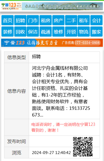 河北宁舟金属线材有限公司诚聘:会计1名,有财务、会计相关专业优先,具有会计任职资格、扎实的会计基础,有1-2年的工作经验,熟练使用财务软件,有意者面谈。联系电话:19133725673 【电话咨询时,请一定说明在宁晋123看到的,谢谢!】 |