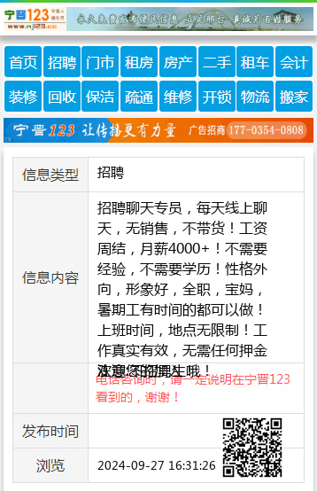 招聘聊天专员,每天线上聊天,无销售,不带货!工资周结,月薪4000+!不需要经验,不需要学历!性格外向,形象好,全职,宝妈,暑期工有时间的都可以做!上班时间,地点无限制!工作真实有效,无需任何押金!
