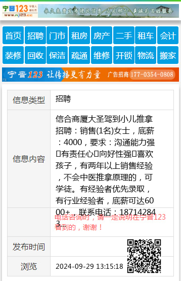 信合商厦大圣驾到小儿推拿招聘:销售(1名)女士,底薪:4000,要求:沟通能力强➕有责任心➕向好性强➕喜欢孩子,有两年以上销售经验,不会中医推拿原理的,可学徒。有经验者优先录取,有行业经验者,底薪可达6000+,联系电话:18714284394(微信同号) 【电话咨询时,请一定说明在宁晋123看到的,谢谢!】 |