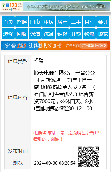 顺天电器有限公司 宁晋分公司 高新诚聘: 销售主管一名工资面议。