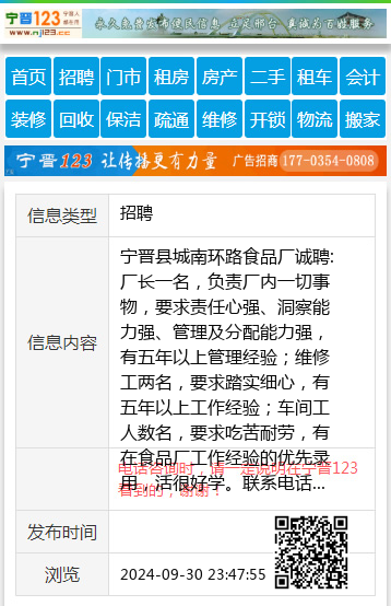 宁晋县城南环路食品厂诚聘:厂长一名,负责厂内一切事物,要求责任心强、洞察能力强、管理及分配能力强,有五年以上管理经验;维修工两名,要求踏实细心,有五年以上工作经验;车间工人数名,要求吃苦耐劳,有在食品厂工作经验的优先录用,活很好学。联系电话18333980897 【电话咨询时,请一定说明在宁晋123看到的,谢谢!】 |