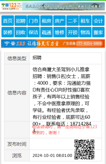 信合商厦大圣驾到小儿推拿招聘:销售(1名)女士,底薪:4000,要求:沟通能力强➕有责任心➕向好性强➕喜欢孩子,有两年以上销售经验,不会中医推拿原理的,可学徒。有经验者优先录取,有行业经验者,底薪可达6000+,联系电话:18714284394(微信同号) 【电话咨询时,请一定说明在宁晋123看到的,谢谢!】 |